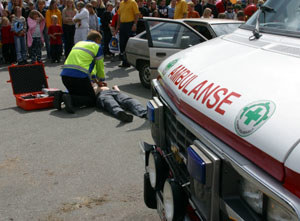 Førstehjelp er livreddende. Her er pasienten stabilisert, og får oksygen mens ambulansepersonellet vurderer tilstanden. | |