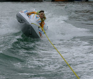 Fort går det, men gøy er det. Her er det like før disse to passasjerene får seg en svømmetur i fjorden. | |